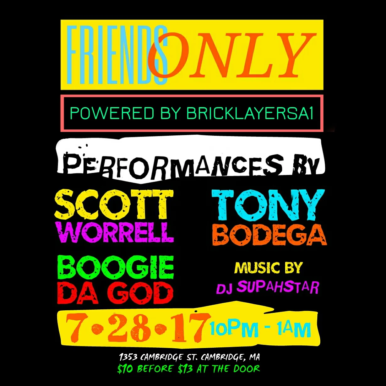Friends Only: Scott Worrell, Tony Bodega, Boogie, Da God Friday, July 28, 2017 10:30 PM 11:59 PM 22:30 23:59 Google Calendar ICS $13 Cover ($10 Advance) / Start 10:30pm / Doors 10pm