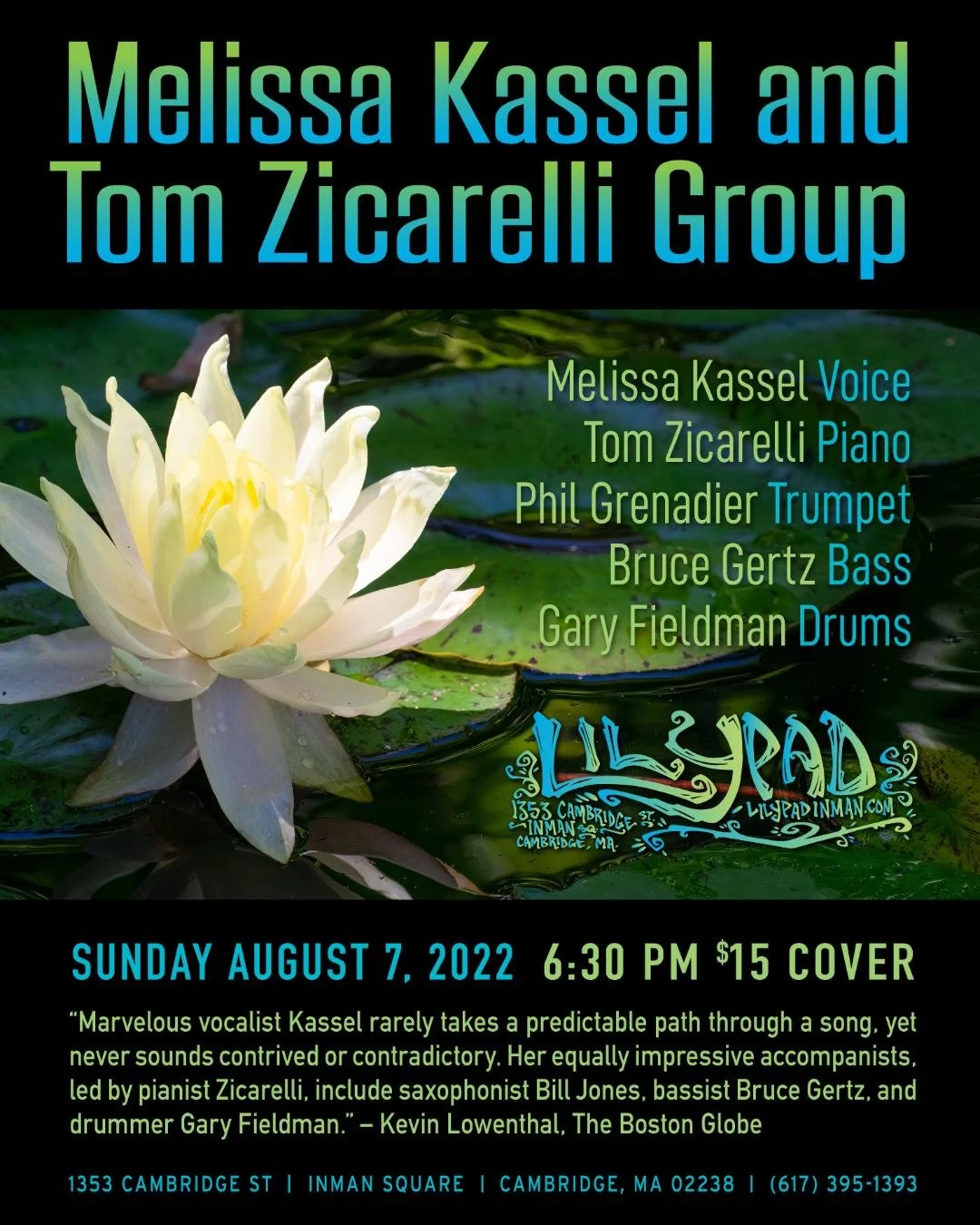 Melissa Kassel and Tom Zicarelli Group Sunday, August 7, 2022 6:30 PM 9:00 PM 18:30 21:00 The Lilypad 1353 Cambridge Street Cambridge, MA, 02139 (map) Google Calendar ICS $15 Cover @ the Door / Start 6:30pm / Doors 6pm / Seated Show Facebook Event Page