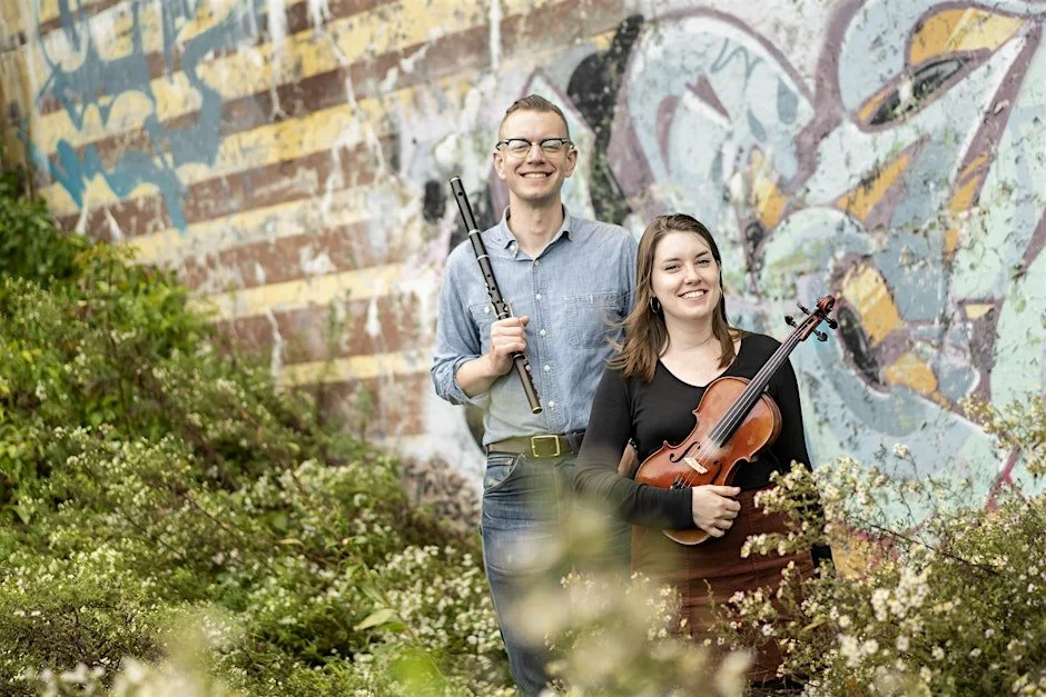 Will Woodson (flute, uilleann pipes) and Caitlin Finley (fiddle) play sparky and driving traditional Irish music that’s grounded in the textures and rhythms of the rich Irish-American soundscape of the 1920s and 30s. With roots in the living Irish musical cultures of Boston, New York City, and Philadelphia, and a tremendous admiration for the first generation of recorded Irish musicians, the duo conjures up the sounds of the dance halls, vaudeville theaters, and house sessions central to Irish-American music from the first half of the twentieth century. In 2019, the two recorded their debut album, “The Glory Reel” alongside box player and piano accompanist Chris “Junior” Stevens, which Dan Neely of the Irish Echo called “a fabulous album from three of Irish America’s finest.” During the pandemic years, the two made “The Phonograph Project”, a Patreon-supported series examining 78 recordings of traditional Irish music made in New York City in the 1920s and 30s. More recently, they’ve made musical appearances at the St. Louis Tionól, the Patrick J. Touhey Memorial Weekend in Boston and the Ward Archives “Archiving Irish America” conference in Milwaukee. Cait and Will live in Portland, Maine.
