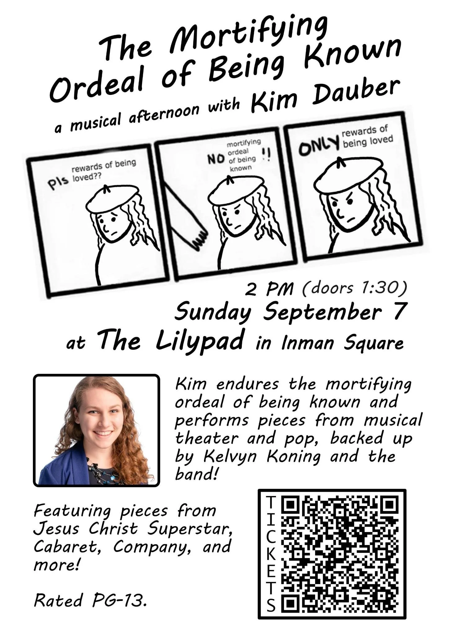 Kim Dauber endures the mortifying ordeal of being known and performs pieces from musical theater and pop, backed up by Kelvyn Koning and the band! Also featuring the vocal talents of Adam Sell, Angelica Ocegueda, and Joshua Dixon Belt.