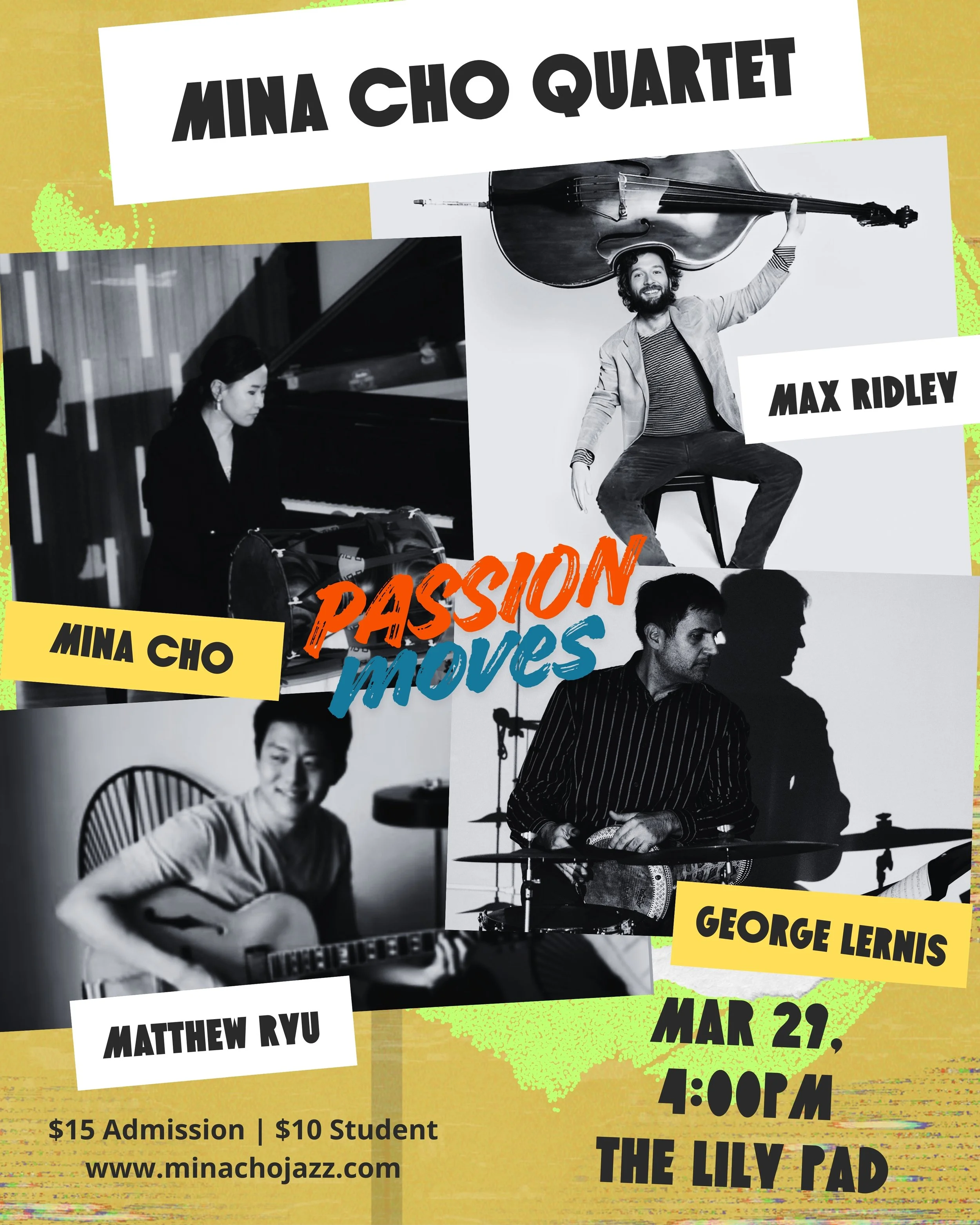 The Boston-based global jazz ensemble The Mina Cho Quartet will present a performance titled “Passion Moves,” that reflects on both the spiritual and personal meanings of passion. Quartet members are Mina Cho on piano and traditional Korean drum, Max Ridley on bass, Matthew Ryu on guitar, and George Lernis on drums and percussion. The program features reimagined originals and new works created by Mina Cho.