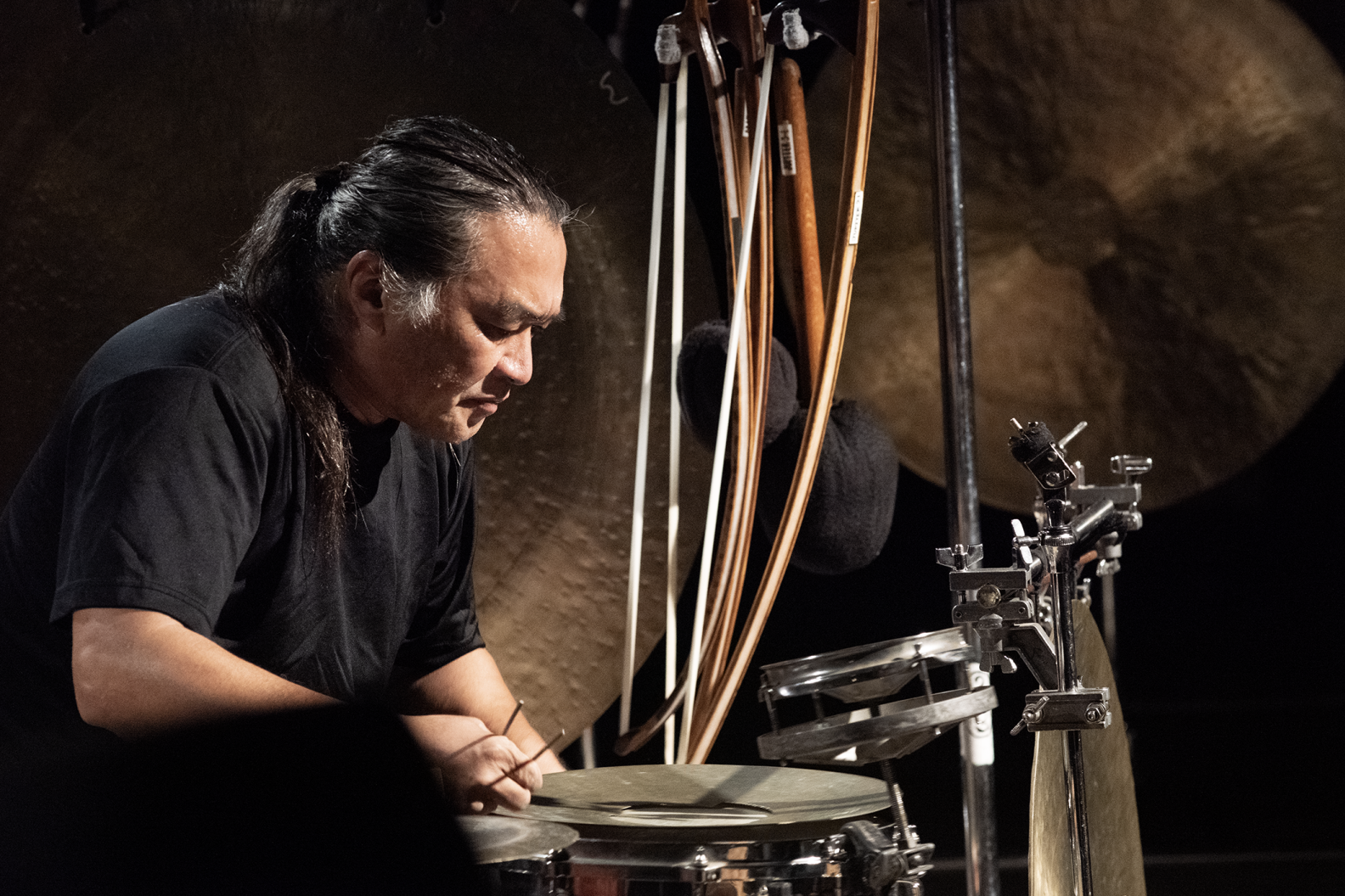 Nakatani's distinctive music centered around his adapted bowed gong, supported by an array of drums, cymbals, and singing bowls. In consort with his personally hand-carved Kobo Bows, he has spent decades refining and developing his sound as an arrangement of formations of vibrations, incorporated in shimmering layers of silence and texture. Within this contemporary work, one can still recognize the dramatic pacing, formal elegance and space (ma) felt in traditional Japanese music.