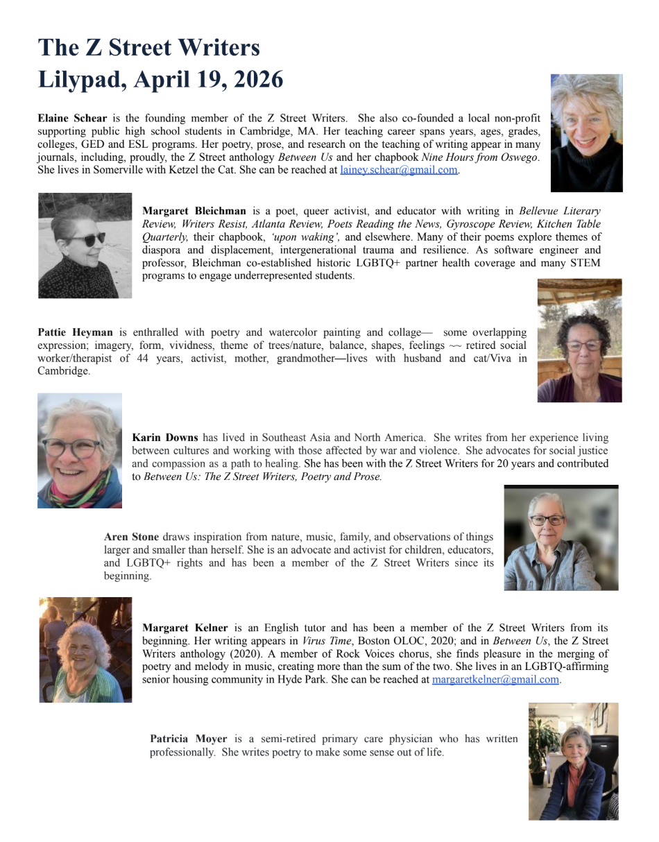 This event is a poetry reading by the Z Street Writers. Donation to benefit LUCE, the Immigrant Justice Network of MA. Z Street is a group of 7 writers who've created a long-lasting learning/writing/collaborating/publishing and reading environment for (mostly) poetry, and prose.