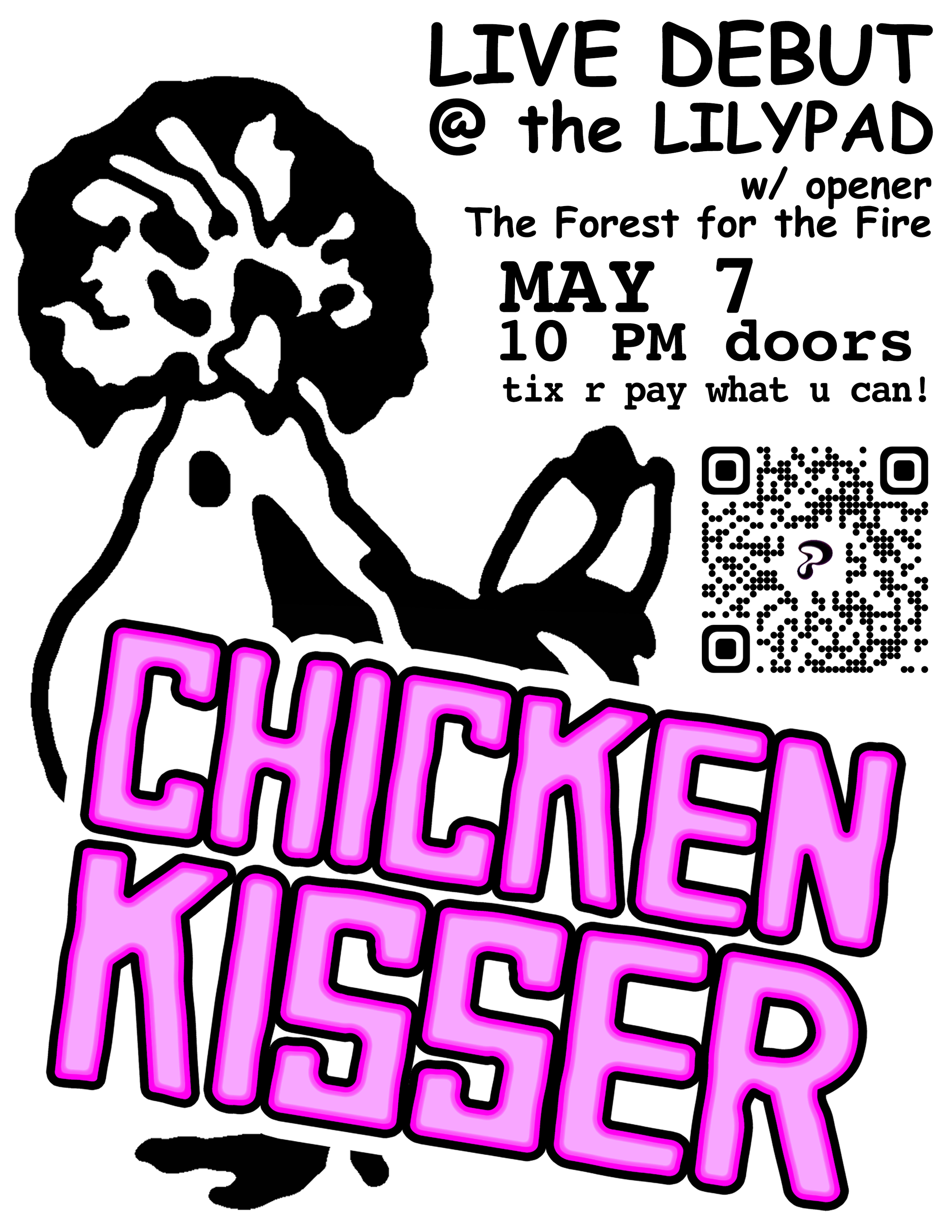 Danni and friends invite you to witness the debut of Chicken Kisser, a band like any/no other; with opener The Forest for the Fire, it is sure to be a time and a place where music happens.
