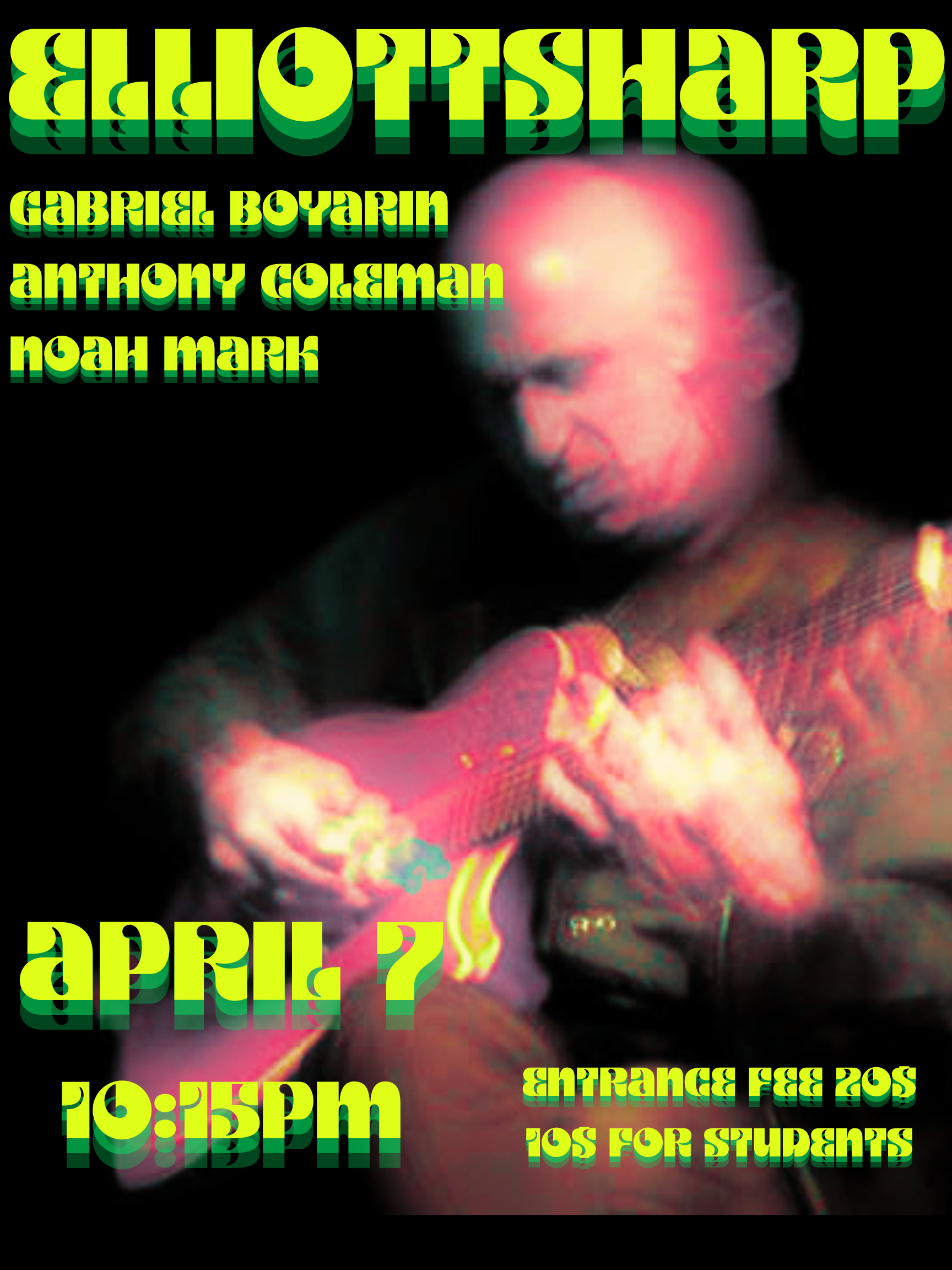 Elliott Sharp will perform solo electroacoustic music on 8-string guitarbass and electronics and then will be joined by guitarist Gabe Boyarin, pianist Anthony Coleman and drummer Noah Mark for an improvisation.