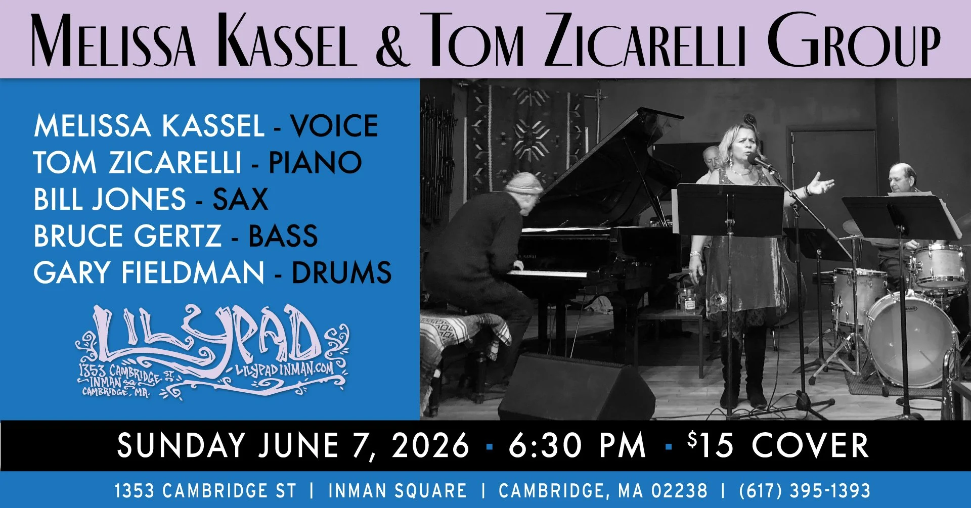 Melissa Kassel & Tom Zicarelli Group Sunday, June 7, 2026 6:15 PM 8:30 PM 18:15 20:30 The Lilypad 1353 Cambridge Street Cambridge, MA, 02139 (map) Google Calendar ICS $15 @ the door / 6:15 doors / 6:30 start / seated