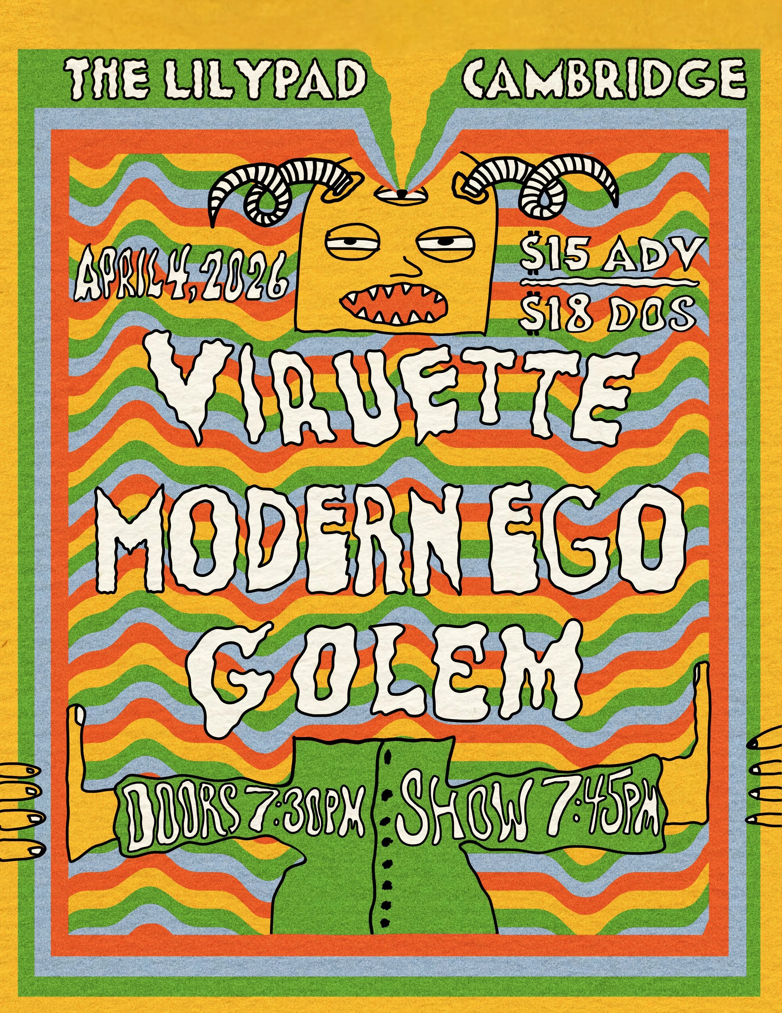 Viruette / Modern Ego / Golem Sunday, April 5, 2026 7:30 PM 9:30 PM 19:30 21:30 The Lilypad 1353 Cambridge Street Cambridge, MA, 02139 (map) Google Calendar ICS $18 day of show / $15 advance / 7:30 doors / 8pm show / all ages Get Tickets