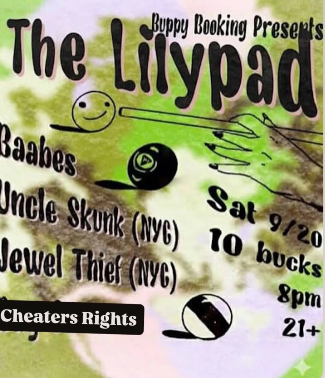 Uncle Skunk & Jewel Thief (NYC) Saturday, September 20, 2025 8:00 PM 10:00 PM 20:00 22:00 The Lilypad 1353 Cambridge Street Cambridge, MA, 02139 (map) Google Calendar ICS $10 at the door / 8pm doors / standingBaabesUncle Skunk (NYC)Jewel Thief (NYC)Cheaters Rights